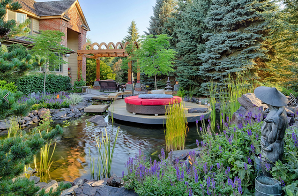 今天为大家带来的庭院是一个有鱼池的庭院,一个把防腐木地台建在水中的庭院私家花园,汀步水中,不甚惬意,这样的庭院自然之感很强,景色非常好看。