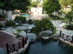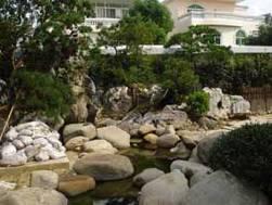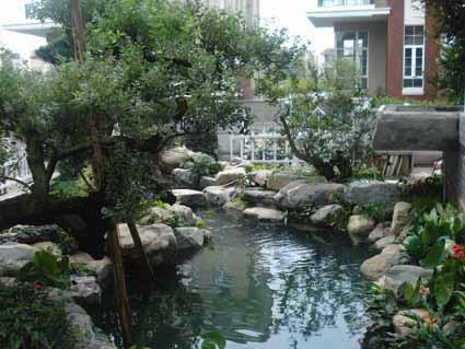池边放置着大小各异的景石,仿佛从远处 景石与水面落差大,池壁外露,失去亲