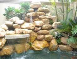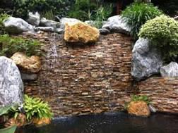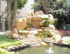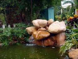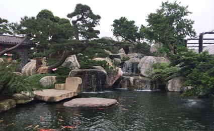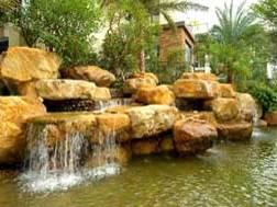 潺潺的流水,水景配以背后高低错落的植 石材凌乱放置,造型不富变化,没有艺术