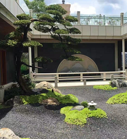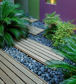 在别墅室内中庭中用于硬质景观制作的有砂和人造石等材料。室内装饰用砂主要是指白砂,这种白砂主要在日本庭院枯山水中被用来象征大海和雪地。在白砂上用工具耙出波纹形状以象征海浪。
